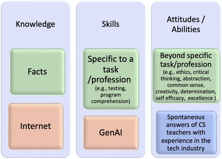 This does not mean that students no longer need to learn CS, but it does shift the focus of their education. If GenAI can deliver Knowledge and Skills, then the role of human teachers may shift toward developing students’ abilities (A)—the mindset, habits, and meta-skills that GenAI cannot (yet) replicate.