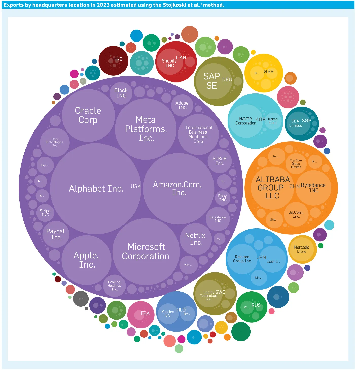 As our central bank colleagues feared, this surplus seems partly unaccounted for in balance of payments data. Trade through commercial presence abroad (what is known formally as “GATS mode 3 trade”) is inherently difficult to measure. There is a reason why the IRS and Meta have been battling over a decade for assets that Meta reports in Ireland.3 This means our estimates are complementary to these published1,2 in a joint effort by the OECD, IMF, UNCTAD, and WTO, which put the “digitally delivered services exports” of the U.S. at U.S. $649 billion and attributes only U.S. $49.7 billion to “computer services.” By using corporate revenue data, we extend this categorical resolution to 31 sectors while helping reconcile the numbers with the fact that many of these companies have revenues that are north of $100 billion and that do not come solely from their operations in the U.S.
