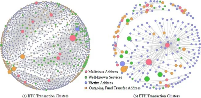 Address clustering. Using victim and money-flow information, we establish relationships among victims, attackers, and terminating services. Figure 2 shows nodes representing the four address types, with node sizes reflecting relative cryptocurrency amounts and edges representing transactions. Each seed address forms a transaction cluster, totaling 22 clusters (10 for BTC, 12 for ETH). Malicious addresses with many outgoing fund transfers are likely colluding accounts controlled by adversarial developers, relying on benign, untraceable services to launder and assemble illicit income. Malicious addresses without outgoing transfers are considered adversary-owned.