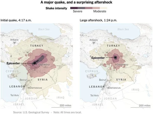 Background. The 2023 Türkiye-Syria earthquakes, also known as the 2023 Kahramanmaraş earthquakes, were two catastrophic events that struck nine hours apart on February 6, 2023, with epicenters in the Pazarcık and Elbistan districts of Kahramanmaraş, and magnitudes of 7.8 Mw and 7.5 Mw, respectively (see Figure 1).