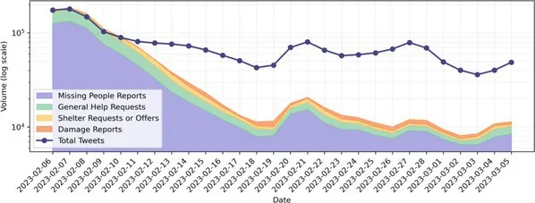 These earthquakes caused widespread devastation in both Türkiye and Syria, resulting in at least 53,537 deaths in Türkiye and at least 8,476 deaths in Syria, with more than 122,000 people injured in total, according to official figures. However, our study focused on Türkiye due to the limited availability of social media data from Syria. Following the earthquake, widespread destruction across 11 provinces (125 districts) in southern Türkiye created an urgent need for resources and timely information. In response, the Crisis Computing team at the Qatar Computing Research Institute (QCRI), in collaboration with the United Nations Development Programme (UNDP), leveraged social media data to provide real-time situational awareness. Within a month of the disaster, the team processed over 94 million tweets and 3.6 million images from Twitter (now X), using event-related keywords to identify relevant content. To enhance the utility of this data, tweets mentioning specific locations, such as provinces and districts, were filtered, resulting in approximately two million geotagged tweets and 627,000 images. These geotagged tweets were further analyzed to identify missing people reports, shelter requests or offers, and general help requests, while the associated images were examined for signs of structural damage reports. The temporal distribution of these information categories over the one-month period is illustrated in Figure 2.