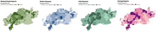 Building actionable maps. The data processed by Mistral-NeMo (short prompt) were then aggregated into district-level maps as illustrated in Figure 3, visualizing the intensity and location of needs such as missing people reports, shelter requests or offers, general help requests, and areas impacted by damage. These visual tools supported UNDP and other responders to accelerate their efforts in assessing the extent of specific information, such as the number and location of shelter requests. Additionally, our social sensing data provided insights into the immediate needs of the affected population—information that would typically require conducting a survey.