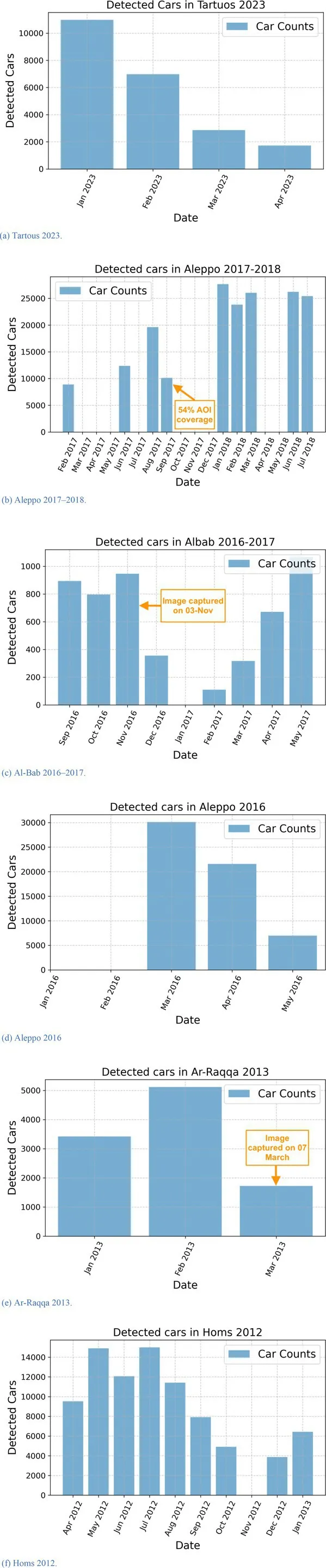 Findings. Preliminary analyses reveal plausible parallels between vehicle counts and internal displacement trends when compared with recorded data from sources such as Internal Displacement Monitoring Centre (iDMC), United Nations Office for the Coordination of Humanitarian Affairs (OCHA), and Assessment Capacities Project (ACAPS), where these sources may have certain spatial-temporal limitations. According to iDMC, approximately 171,000 people were displaced from Tartous by July 2023. Our analysis of vehicle counts based on available imagery from early 2023 indicates a significant decline in the number of vehicles across the city between January and April (see Figure 5a). Additionally, iDMC highlighted the impact of a local ceasefire in Syria in 2018,7 which led to the return of families to Idlib and Aleppo. The report estimated that around 66K people were displaced to these two cities. In line with this report, our analysis shows an increase in the number of cars in Aleppo in 2018 compared to 2017; except for a drop in September 2017 due to low area coverage (see Figure 5b). However, no images from Idlib were available in our dataset for this period. Furthermore, a case documented by iDMC and OCHA regarding the Battle of Al-Bab,6,17 which took place between November 6, 2016, and February 23, 2017, reported that 66K people were displaced. Our analysis indicates a decline in vehicle counts after November 2016 (based on an image captured November 3), followed by an increase after the battle ended in March 2017 (see Figure 5c). In 2016, OCHA documented conflict events and internal displacement between January and May.16 Our analysis identified a correlation between the reported conflict events in Aleppo during April and May and fluctuations in vehicle counts over the same period (see Figure 5d). In 2013, ACAPS reported1 two significant displacement events: one in Ar-Raqqa on March 4 and another in Homs by February, causing significant displacement. Our analysis indicates a decline in car counts after these dates, as shown in Figure 5e, with the image captured on March 7 and in Figure 5f, presenting the data from August 2012 to January 2013. These findings suggest that vehicle detection in satellite imagery can effectively support humanitarian organizations in monitoring population displacement in near real-time, offering an innovative solution where conventional methods are constrained.