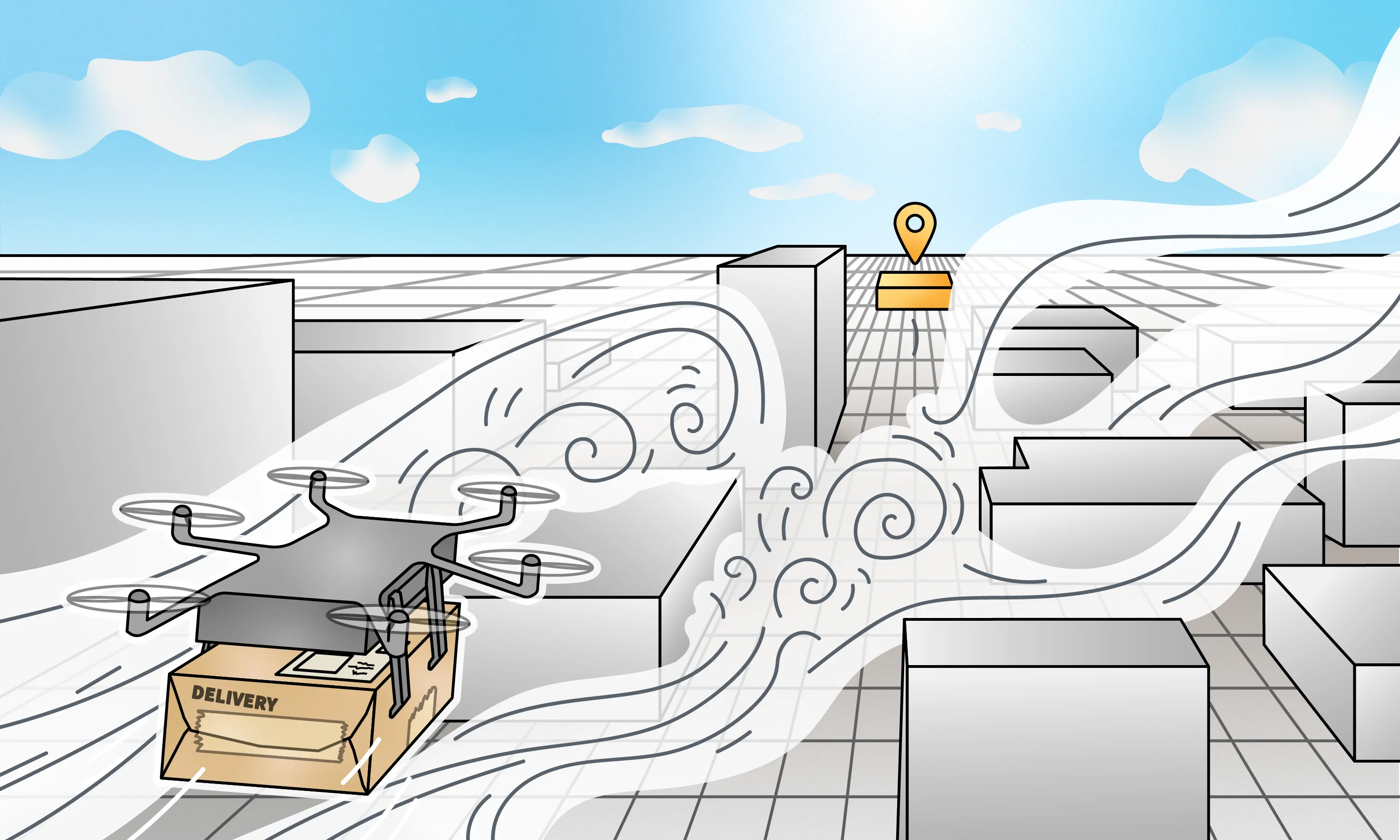 Collision avoidance with probabilistic safety guarantees. The grid world for the second demonstration is depicted in Figure 11. In this example, the UAV has to deliver a package without crashing into a building, while wind affects its movement. The wind direction is modeled individually for each cell, with a 5% probability that the wind displaces the UAV in its direction. We compute shields that provide probabilistic safety guarantees (see earlier section, “Shielding with Probablistic Guarantees”), using a finite horizon of 20 time steps and the probability thresholds , where limits the risk the agent is allowed to take. As before, we compare unshielded and shielded RL for finding a policy for delivering packages, using a similar reward function.