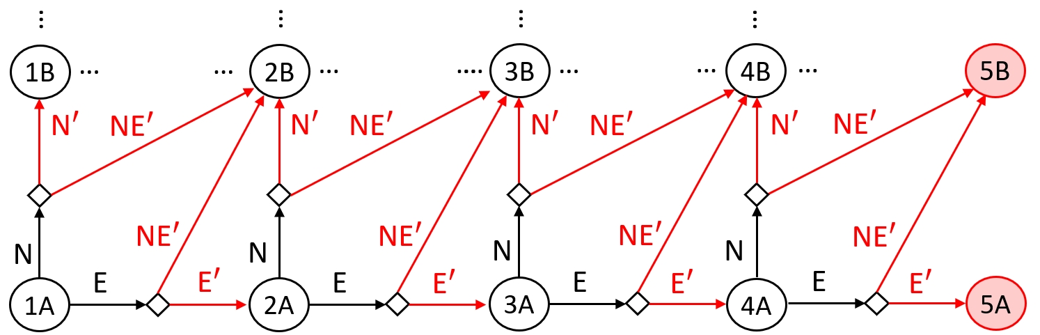 Example 2. Figure 6 depicts the two-player game graph derived from the MDP in Figure 5. The agent-player first selects an action, followed by the environment choosing its action. These decisions determine the subsequent state. For instance, when the agent selects Action N from Cell 3A, the environment can either move the UAV to Cell 3B by choosing Action N’ or to Cell 4B by selecting Action NE’.