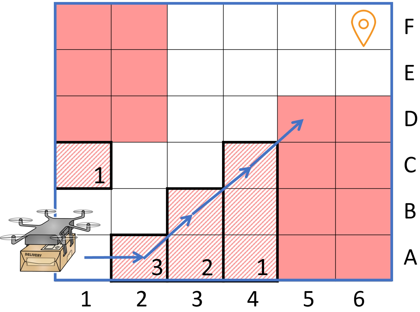 Collision avoidance with absolute safety guarantees. Figure 9 illustrates the grid world for the first demonstration. The agent’s task is to control UAV-1 to deliver packages to a designated target position. The safety objective is to avoid collisions with UAV-2 (framed in red) and buildings.