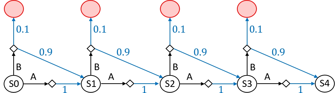 Example 4. Consider the MDP shown in Figure 8. As a safety specification, we want to ensure that the probability of reaching a bad (red) state does not exceed within, say, four steps. This specification is satisfied by any policy that takes action at most once.